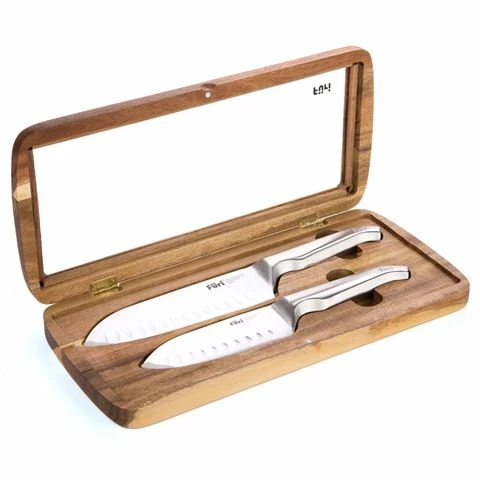 - A set of two matching Santoku knives presented in a wooden Furi box.