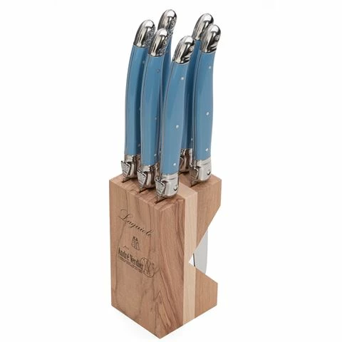 The set of six serrated knives have a cornflower blue handle and features the symbolic fly on the side. They can be housed in the included wooden block.