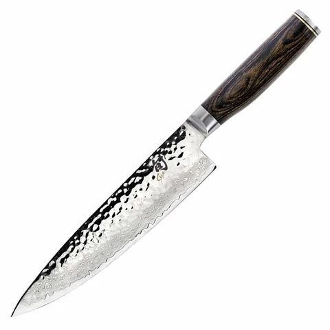 A Shun Premier 20cm Chef’s Knife is an essential for the kitchen. Lightweight and agile, the 20cm blade length and razor-sharp edge, slices, dices and chops vegetables and fruits. Shun Premier’s thinner blades makes this chef’s knife lighter and less tiring to use than comparable European-style chef’s knives. The wide blade keeps knuckles off the cutting board and comes in extra handy when transferring cut food from board to pan. With its curved belly, the chef’s knife can be gently rocked through fresh herbs or spices to produce a very fine mince. . Proving its versatility, the chef’s knife can be gently rocked through fresh herbs and spices to bring a professional look to garnishes and more.